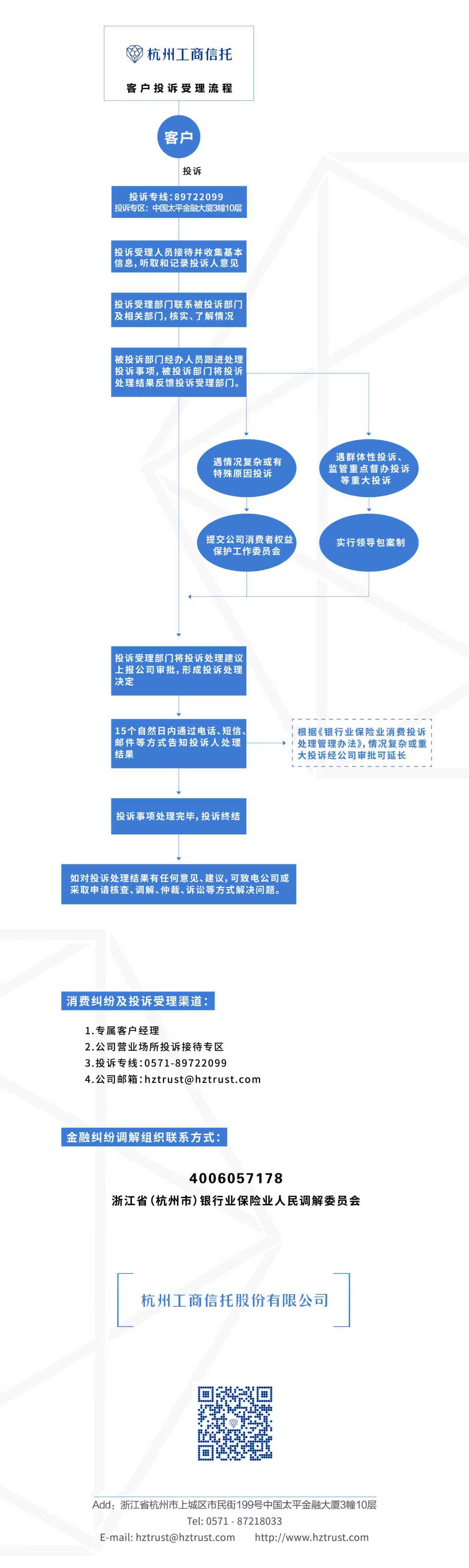 1.專屬客戶經理2.公司營業(yè)場所投訴接待專區(qū)3.投訴專線:0571-897220994.公司郵箱:hztrust@hztrust.com